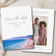 Fånga skönheten i Malibu och bjuda in dina gäster med stil med denna fotoförhandsinbjudan. Framsidan visar en fantastisk bild av Malibu-stranden och sätter tonen för din bröllopsdag. Lägg till ditt eget foto på baksidan och anpassa texten för att göra den till din egen.