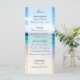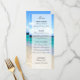 2 sidade Bröllop-menymall för Beach Wedding. Första sidan visar aptisatorer, sallad, huvudkurs och dessert mot ett dramatiskt blått hav med sandstrand. Vita puffa moln i bakgrunden med vackra skugga av blå himmel. Baksidan har samma vackra bild av en perfekt strand. Du kan anpassa på vilket sätt som helst med fält, teckensnittsval och färg. Perfekt för brud- och groomstrandmottagning för bröllop eller annan speciell händelse.