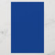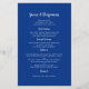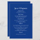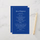 Tunga blå bröllop-menyn med vit ordalydelse. Anpassa många avsnitt och linjer på det här prisvärda platta kortet. Skriptteckensnitt används för namn av bruden och trimningen överst och för avsnittsrubrikerna. Varje textavsnitt kan innehålla 2 eller 3 linjer och entrénumret kan vara två eller tre. Ange även datum och plats för händelsen överst. Blåblå färg på båda sidor.