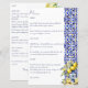 Amalfi Positano Vietnam Blue Majolica tiles lemons bröllop menykortsmall , blåvita och gult plattor i Medelhavet med citruskloner och citrusblommor i blått keramiskt vas-menykort personlig bordsvara av typen bröllop