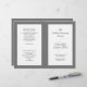 Mörk grått- och vita bröllop-ceremoniprogram med textmallsområden för att ta emot en längre katolsk ceremoni. Teckensnittet för svart elegant skrivs ut över vita paneler på framsidan och baksidan. Fold på halv sida efter att du har tagit emot vilket kommer att placera skriptet och tack-meddelandet på baksidan av programmet. På andra sidan (som kommer att vara programmets mittsidor) finns ordningen för ceremonin och avsnittet bröllopsfest för att lista alla som är involverade i att skapar den dag som är så speciell. Även om detta exempelprogram är utformat för en katolsk tjänst, använda det för alla typer av bröllop. Lägg till blanksteg om du vill att texten ska passa bättre.
