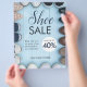 En attraktiv svängplan i blå toner som har en design av skosor runt text som tillkännager en skobförsäljning. Underbar för butiker för butiker som erbjuder försäljning, rabatter, stora öppningar och VIP-dagar. Med flygbladsdesignen kan du din försäljningsrabatt, plats, timmar, spara datumet och mycket annat.