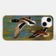 Manlig och kvinnlig gräsänder anka under flygning över en gulddamm, vatten under upplopp för att spegla färgen av den bakgrundskoncentration av höstblad som glöms i solljuset. Realistiskt konstnärligt verk skapat från en ursprunglig oljemålning av naturkonstnären Crista S. Forest.