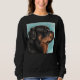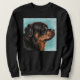 Målning av en positiv rottweiler från den ljusblå sidan med blå bakgrund.