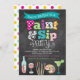 Vår ljusa och färgglada Måla och Drick Målningfest Konstkort stil inbjudan är den perfekta inbjudan för alla målning- och vin-evenemang. Vår design har en konstkort-bakgrund, en blandning av roliga mönsterbokstäver som prickar, ränder och sicksack, och konstillustrationer och grafik som en konstnärspalett, vinflaska, vinglas och margarita!