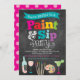 Vår ljusa och färgglada Paint and Sip Målning Fest Kritbräda stil inbjudan är den perfekta inbjudan för alla målning och vin evenemang. Vår design har en kritbräda bakgrund, en blandning av roliga mönsterbokstäver som prickar, ränder och chevron, och konst illustrationer och grafik som en konstnärspalett, vinflaska, vinglas och margarita!