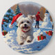 En flytande maltesisk glad springa genom snölandskapet med en fin röd julhatt. Den här charmerande vinterscenen belyser rasens silke jacka, lekfull personlighet och helig själ samtidigt som man fångar julhelgens värme och magi. En underbar design fylld med festlig charm.