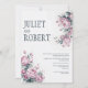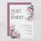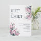 Denna eleganta och snygga bröllopsinbjudan är perfekt för sommaren och våren. Den har vattenfärgrosor och blad. Typografin är fet och modern, och färgschemat inkluderar lila, smaragdgrönt och vitt. Den är romantisk, klassisk, stilren och unik; den perfekta designen för att imponera på dina gäster.