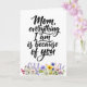 Det här kraftfulla och uppskattande kortet har citatet "Mamma, allt jag är är tack vare dig" mot en ren bakgrund med en fantastisk rad akvarell- vilda blommor. Kombinationen av meningsfull typografi och organisk botanisk konst skapar en sofistikerad och hjärtlig design.