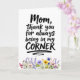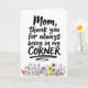 Visa ditt stöd för kvinnan som alltid har stöttat dig med detta kort med frasen "Mamma, tack för att du alltid finns i min hörna". Designen ramas in av en vacker, handritad akvarellvildblomsgräns vid basen, som symboliserar tillväxt och konstant kärlek.