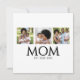 Svart Vit Mamma Etablerad Klassiska Kapsyler 3 Foto Design. Ersätt bilderna med egna av dina barn och ändra åren till de år du blev mamma. Klassisk svart serif-teckensnitt kan anpassas genom att ändra MOM till MUM, MAMA eller till och med MIMI. Detta Mom Est. Morsdagskort skulle bli en bra present - speciellt för en ny mamma - eller födelsedag, eller "bara för att" om du ANPASSAR MEDDELANDET INUTI. Detta är en tidlös, stilren design som talar volymer. Vänligen skicka meddelande till mig för extra varumärke för souvenirkort för din mammagrupp eller kyrkoförening.