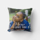 En söt Mamma jag älskar dig foto kastkudde med ett fullbleed-foto med elegant vit script och blocktextöverlägg. Den tvåsidiga designen möjliggör ett annat foto på baksidan med samma textöverlägg. All text är fullt redigerbar — en hjärtlig morsdag eller födelsedagspresent från barnen.
