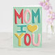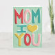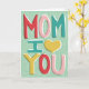 Ett morsdagskort till din enda och riktiga mamma, detta kort har handillustrerade och textade element i vackert teal, rött, rosa gult på en blek mintgrön bakgrund. Meddelandet lyder "Mamma, jag älskar dig" på framsidan med lättanpassad text på insidan för att skapa ditt eget speciella meddelande.