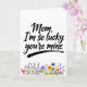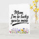 Denna glada och ljusa design visar frasen "Mamma, jag är så lycklig att du är min" i ett stilrent, modernt typsnitt. En ömtålig anordning av akvarell- fältblommor i olika nyanser av rosa, gult och lila blommar längst ner och ger kortet en mjuk och konstnärlig känsla.