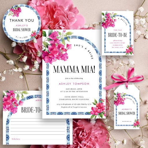 This Collection showcases a beautiful blue Italian tile arch, drawing inspiration from Mediterranean allure, and is framed by vibrant pink watercolor florals for a romantic and lively accent. The playful "Mamma Mia!" tagline injects a cheerful, festive spirit, perfectly establishing the atmosphere for a chic and memorable baby shower. This design harmoniously combines classic sophistication with a whimsical touch, making it perfect for a summer or Italian-themed event. Please contact us for design assistance via Zazzle Chat or email stephanyanddany@gmail.com. We will respond within 12 hours.