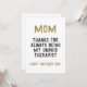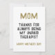 Mamma Obetalad Terapeut Rolig Humor Mors Dag Kort. Roligt mors dag-kort med humoristisk citat 'Tack för att du alltid är min obetalade terapeut'. Texten är i modern fet typografi. Du kan ändra valfri text på kortet.