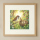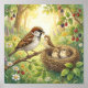 En söt och försiktig illustration med en sparv-mamma och hennes ungar, som fångar ett fredligt ögonblick i den mysiga skogsvärlden Ivory Nest.