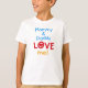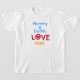 Mammor och pappan älskar mig T-tröja, långärmadutslagsplatser, sweatshirts, pulloverhoodies, hattar, rufsar skjortor, sleeveless klänningar, rufsar klänningar, raglanT-tröja, fotbollbodysuits, organiska bodysuits, och annan dräkt för bebis med text av rött, blått och guld med en hjärta, som läser mammor och pappa, älskar mig!