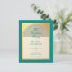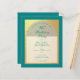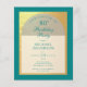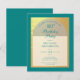 En modern födelsedagsinbjudan. På en tealblå rektangulär bakgrund finns en falsk guld folie-båge som inrymmer text i teal på vit bakgrund. Orden Födelsedagsfest är skrivna i en elegant kalligrafisk stil; den första raden är välvd text.