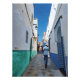En man rullar genom en levande, smal gränd med färglöst byggnad i en solig Medelhavsstad, som fångar vardagens innersta väsen och arkitektoniskt charm.