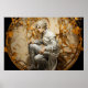 Surrealist målning av en stilig ung man med vitt hår som bär ett vitt kostym som böjde sig ner för att observera något vid hans fötter. Han står fast vid en gyllene cirkel av stiliserade vinstockar och borst. Skapad med generativa algoritmer och Photoshop.