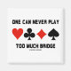 Om du känner att du aldrig kan spela för mycket bro och spela in på morgonens veckotimmar i bryggsturneringar, så kommer du att njuta av den här magneten med de fyra korten kostym tillsammans med talesättet "Man kan aldrig spela för mycket Bridge". Få andra att ta en dubbla med en dos tunga-in-cheek-bro/duplicera bron stil med den här magnet!
