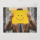 En affärsman har en kvadratisk gult papper med ett leende ansikte, som drar på sig den, som döljer sitt ansikte, medan han står på en stadsgata