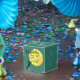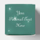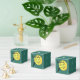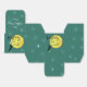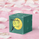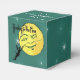 Den här festen eller presentboxen är en djup grönt med vita lysande stjärnor och en man som klättrar på en stege till en gult måne med en ansikte som vinkar med texten "Reaching for the Måne". Anpassa din egen text på översta sidan med mallen.