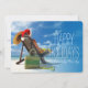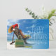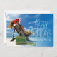 Man slappnar på stranden i tomtens hatt julkort