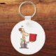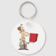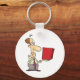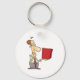 En man tittar nyfiken vid en röd låda. Den här designen ser ut att vara effektiv i den här nyckelkedjan