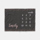 En unik milstolpe i baby-månaden visar att ro guld har konetti med mörk grått-bakgrund. Du kan ändra bakgrunden till färg så som du vill och anpassa den med baby namn. Den här moderna filten är redo för dig att dokumentera din lilla flickas tillväxt. En perfekt barnduschpresent till en ny mamma.
