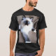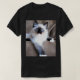 En elegant T-shirt-design med en lekfull siamesisk katt med piercing blue ögon, omgiven av minimalistiskt geometriskt mönster och mjukt pastel färg, med tonvikt på elegans, charm och kattdjur nåd.