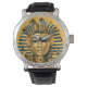Manar Kung Tut Egyptian Black Leather Strap Watch visar ett vackert foto av Kung Tuts Mummy Mask