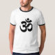 Högkvalitativa manar t-skjorta med svartklippning på nacke och sleever med meditationOm-symbol på bröstkorg.