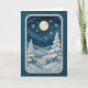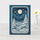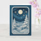 En slingrande flod skär genom snöiga kullar under en lysande fullmåne i denna skiktade illustration i papperklippstil. Stiliserade tallar, fallande snöflingor och avlägsna bergssilhuetter skapar ett lugnt vinterlandskap utfört i mjuka blå- och vittoner. Den stjärnfyllda himlen och de intrikata snöflingdetailsen frammanar en tyst underbarhet och känslomässig stillhet.
