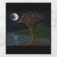 Färgrik naturscen. En månbelyst flod, böljande kullar och ett färgrikt träd med blad som blåser i vinden.