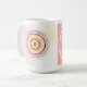 Sip från en snyggt mugg designad med en mandala i mjuk färg av rosa, gult och vitt.