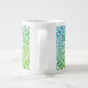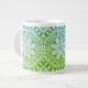 Mugg, som har en generös storlek, är täckt av en vacker, mandalabaserad utformning i ljusgröna och blå nyanser. Originalkonst av Sång Kristensen.