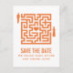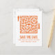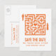 Sällsam och rolig Love Maze Save the Date vykort i orange med en labyrint med ett hjärta i mitten och en brud och en brudgum på varsin sida som väntar på att hitta varandra och kärlek. Denna söta design är ett charmerande val för att tillkännage er kommande bröllop! Lätt att anpassa, skriv bara in detaljerna om er bröllop i de medföljande textfälten. Klicka på "Anpassa" knappen för att hitta fler anpassningsalternativ.