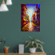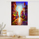 Färgfull del av en väg som går genom en stad nattetid med fullt i himlar. Det här är en AI-skapad konst.