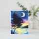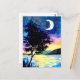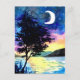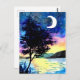 traditionell vattenfärgsgrafik som skildrar en färgfull solnedgång ovanför avlägsna backe och sjö, medan måne och stjärnor redan kan ses på vykort under mörken himlar ovanför träd toppar.