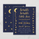 En budget baby shower inbjudan med gyllene stjärnor och måne på vänster och höger kanter. Den har en marinblå bakgrund. Texten är gyllengul och vit. Titeln "Twinkle Twinkle Little Star" och namnet är skrivet med en gyllene handskriven stil, med små stjärnor på i i orden "Twinkle".