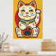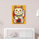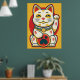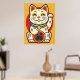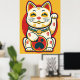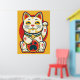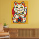 Denna klara illustration har en traditionell japansk Maneki Neko, eller "Lucky Cat", som skildras i ett charmigt och vismiskt stil. Katten visas upprätt i sitta och höjer sin lämnat tass i en välkomnande gest som tros ge bra lycka och lycka. Katten har ett vackert och glatt uttryck, med ögon och mun böjd till ett milt leende. Maneki Neko är till övervägande del vit med fläckar av gult och rött, vilket ger en livlig och färglös beröring. Det bär en grönt i krage med en guld-klocka, som symboliserar välstånd och välstånd. Katten har ett stort, rött mynt med svart tass avtryck och betonar ytterligare sin roll som bärare av tur och bra förmögenhet. Bakgrunden har en fetstilt röd cirkel som förbättrar kattens ljusa och glatta utseende. Den övergripande konstruktionen har en retro, något kränkt struktur, ge den till en nostalgisk och tidlös känsla.