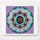 Purpurfärgad guld- och gröntmandala med yin-yangs och om-symboler. I lavendelblått och mintgrönt.