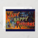 Dramatiskt ljus, rött och guld-tecken och violeter adlar detta antika hälsningskort. Uttrycket Många Lycklig Returnerar används nu främst för födelsedagar, men före mitten av 1800-talet användes det för vilken helgdag eller firande som helst.