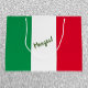 Ha lite roligt med den här presentpåsen som dekoreras i färg i den italienska flagga - med MANGIA! i skriptteckensnitt.
