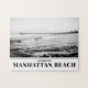 Det svarta och vita pusslet har en häpnadsväckande syn på Manhattan Beach Pier, som fångas upp från havet. Bilden vintage-stil visar att piren sträcker sig ut i havet, med stranden och omgivande kusten synliga i bakgrunden. Det är perfekt souvenir eller gåva till strand älskare, fläkt av medelhundradets moderna fotografi, eller någon som kärlek Kalifornien kusten.