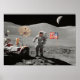 En APOLLO-astronaut står på månens yta nära en månrover med en amerikansk flagga planterad bredvid dem. Men är det verkligt eftersom månen syns tydligt i den avlägsna himlen ovanför månlandskapet.