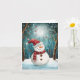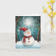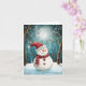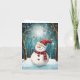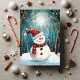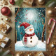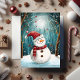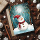 Skicka förtrollande höst- och julhälsningar med detta charmiga julkort som visar en bedårande snöman iförd en fantastisk röd prickig mössa och rutig halsduk, stående i en magisk månbelyst skog. Ömtåliga utsmyckningar dinglar från snötäckta grenar medan snöflingor driver genom den drömlika, teal- och vita vinterscenen. Illustratörens saga-stil fångar årstidens under och glädje med sin mjuka, måleriska stil och fängslande detaljer. Perfekt för att sprida leenden och säsongens magi. Fullt anpassningsbart internt meddelande.