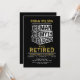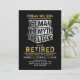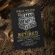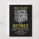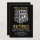 "Mannen myten legenden har gått i pension" typografi design i svart guld och vitt, personlig namn och fest detaljer. Bra pensions inbjudningar.